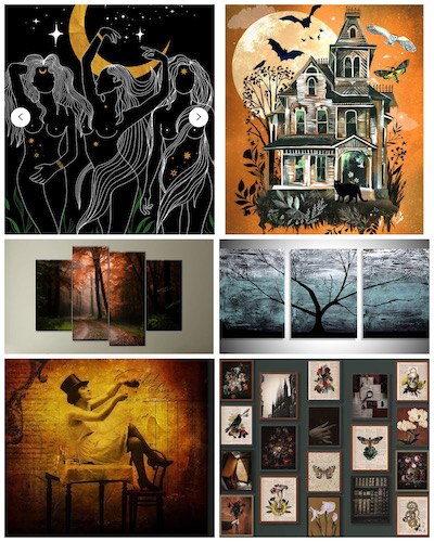 Which leads me to the dark blue accent wall. Right now it is empty and dark and blank, a perfect canvas to decorate! What I would like to do on this wall is fill it with closely-set, framed pieces of art and photography, collected over time, as well as potentially some antique hand-mirrors, hanging skeleton keys, etc. Some might actually be photos that I take, but I mostly want to focus on discovering and supporting small artists and photographers selling locally or online. I have very specific tastes that I’m aiming for, and this collage shows a general idea of that, but the problem is that I’m really no good at finding artists. Mostly, I come across them on the recommendations of friends! Like, I absolutely adore the Jennifer Gordon artwork that accompanied the old RIP challenges (back in the 2009/2010 era!) and used to have several framed pieces from her etsy store, but that store no longer exists there doesn’t seem to be a way to purchase on her website. (Don’t ask why I got rid of my original prints. It’s a long story that had to do with subsuming my personality in 2015, and I still regret it.) I never would have discovered Gordon’s work if not for my online friends, so if you have any artists you love, please send me links! Obvs I won’t be buying an entire wall’s worth of art right away, but my birthday is coming up in March so I’d love to be able to put links out for folks before then! Even if you don’t think the artists you love fit the aesthetic, please leave as many links as you like! I always appreciate discovering new things.