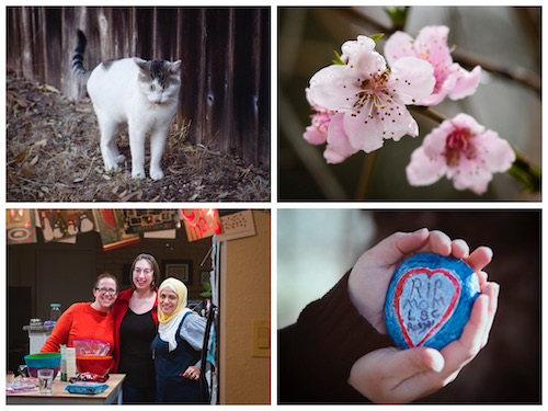 Clockwise from top left: Unicorn’s Big Stretch; nectarine blossoms under freezing rain; a message found in the crook of a tree; game night with my lovely friends (Jennine, Sisa, Alia)