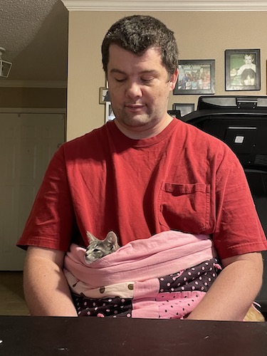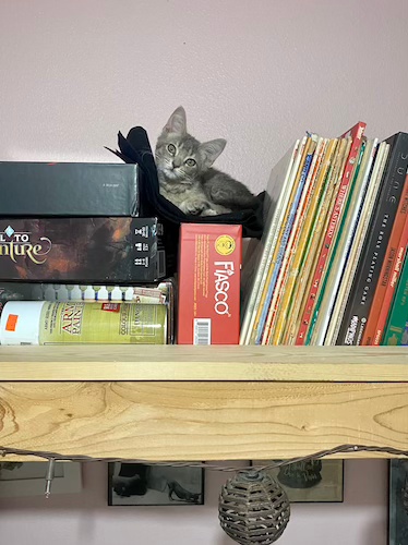 We thought, from the description on the foster list, that Petunia was a relatively healthy kitten, but when we picked her up, it turned out she had diarrhea and a stubborn upper respiratory infection that took three rounds of different antibiotics to clear. In those early days, she was clingy and cuddly and sweet. She got so lonely if she had to stay in her room, so we often ended up bringing her to other parts of the house with us, curled up on chests or perched on shoulders, as we did other things. Our cats were very interested in her, even Jojo, who hates 99% of other cats. She wasn’t the foster that I got emotionally closest to, but she was the first one that made me think, wow, she’d fit right in with our household if we didn’t already have seven. (No, I didn’t consider adopting her for a second.)