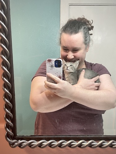 I know this post is long, so I’m going to end with a funny little story. We can always tell when a foster is ready to move on when they begin to escape. With Petunia’s unique circumstances, she stayed with us a lot of the time. In the evenings, she’d be in my room (all the other cats kicked out) for a pre-bedtime play-and-snuggle before I went to sleep. Earlier this week, I got up from where Jason and I were talking and scrolling Tiktok (yes, we’re old!), and didn’t see Petunia on my armchair, which is where she usually settles in after she’s done playing. I realized I hadn’t heard her playing for quite some time. We looked around, but she wasn’t anywhere in the room. It turned out, she’d slipped through the door about an hour earlier, and she’d spent the entire time that we thought she was in with us out in the wider house, exploring and interacting with our cats. The scamp! Thankfully, none of our cats reacted poorly. They’re pretty used to seeing her around, but you never know what will happen when they start interacting. That’s why it’s meant to be monitored! Oh, Petunia! Hopefully this little girl finds her forever home quickly!