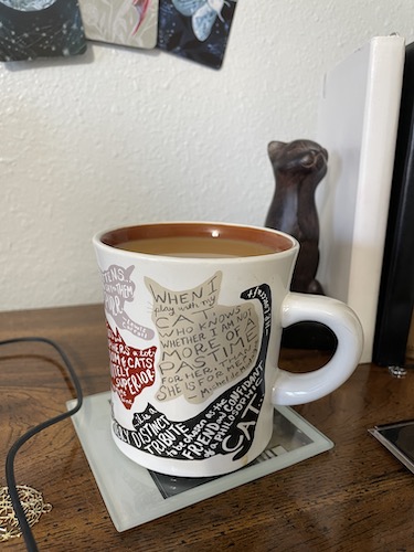 PS – One little sad note: Dewey really misses his mom. One of the signs of distress that kittens show when they’re weaned too early is trying to suckle on things. Dewey will mew plaintively and try to suckle on his brothers’ necks, or my neck, or my fingers, and (weirdly) my eyelids. He can’t be comforted, because obviously there will be no milk forthcoming. And we have to try to keep him from suckling on his brothers, because if he suckles the wrong part (hem), it can lead to permanent nerve damage in said part and problems with incontinence. While the other two kittens seem less distressed about their separation – Huey is generally bigger and more physically developed, while Louie is a no-brains kind of kitten – Dewey is clearly upset and unwell, so we’re giving him all the attention we can.
