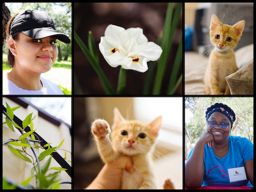 Top row, left to right: portrait of Alex; iris in bloom; sweet little Bean