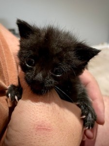 I haven’t talked about this much, but there’s been a bit of a chaotic shuffle on this front. First, we turned in Sassafras, who got adopted immediately as expected, and then we were foster-free until the last couple days when we picked up Mr Juicy, an almost-four-week-old bottle baby who is pure chaos incarnate (pic below). More on him later. But I do have further news about the actual ferals in our yard, too. Lord Grey and Unicorn have pretty much stopped coming to see us. When the two of them became friends, Unicorn brought LG to his home base, which was apparently the same colony that our tabbies came from, by the hoarding house. Why the colony caretakers never TNRed him is beyond me, but whatever. Anyway, I’ve seen him and LG both lounging around on their driveway, on their bins, inside their garage and even on cat beds there! They’ve been sitting fairly close to the caretakers, and Unicorn ran up toward me once when I passed by. Hopefully they’re both getting super social under that colony’s care.