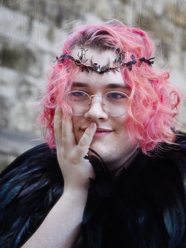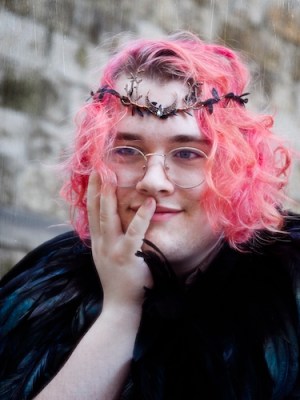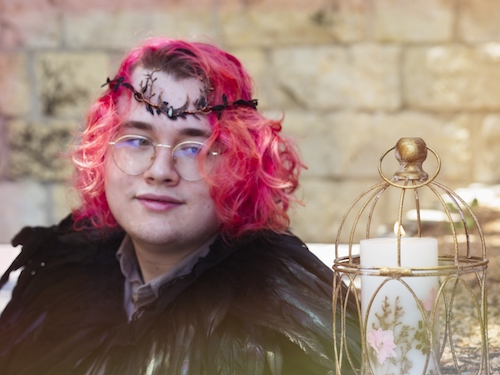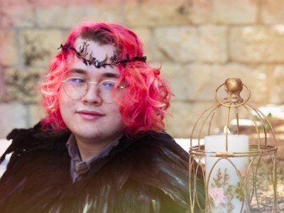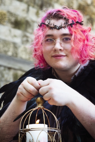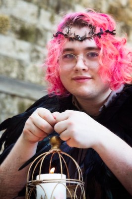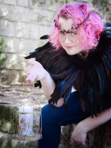 Before leaving home, I grabbed my feathered caplet/pauldron and a woodsy circlet tiara. (And my camera, of course.) Then I stopped at a nearby Michael’s and grabbed a candle and lantern-cage on clearance, and we headed over to the runoff area. A few small props can go a long way in a photoshoot, and the candle matched L’s current hair color perfectly! The runoff area was shaded in the spot we set up, and I got a half-dozen fun photos to work with.