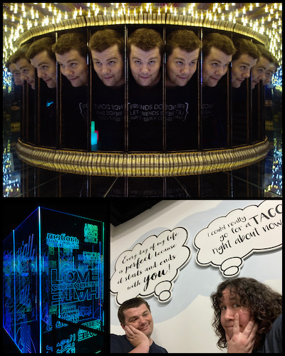 The exhibits change depending on what artists are featured, with a few permanent structures (like the ball pit and the rainbow cave). Some rooms were filled with murals the size of entire walls. Some had swirling digital art that reacted to your movements. There was laser spray paint and optical illusions and a maze of clear walls with messages of unity and human rights written in many different languages.