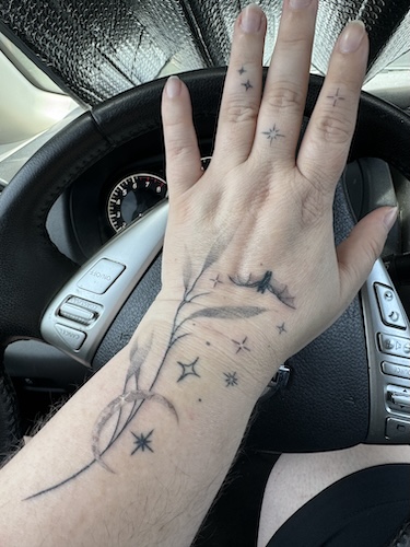 For my seventh tattoo, I booked with a woman named Kristin who does fine line ink at Twisted Tattoo in San Antonio. (Notably, this is also where Keith, who did my Dead Cute tattoo, has his studio.) I’d wanted to get this tattoo done pre-Oct-2023-cruise, particularly because it would be visible on my hand even if I wore long sleeves. I was really looking for visible indicators of queerness as I was embracing my personal identity more and more. I know a tattoo doesn’t say much, but I also know that when I see people with lots of tattoos, I’m more inclined to trust them above other people. So.