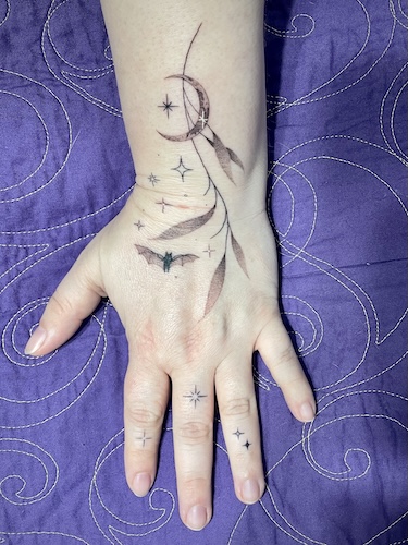 I didn’t know exactly what I wanted when I started out. Mostly, I just wanted something easily visible and that would fit my personal style. I’d seen Kristin do a lot of little ephemeral dragons that I adored, and I had some ideas of willow leaves and moons and stars. I prefer bats to dragons, and so I sent a bunch of reference photos, including ones from tattoos that Kristin had done, and I let her put together a design for me.