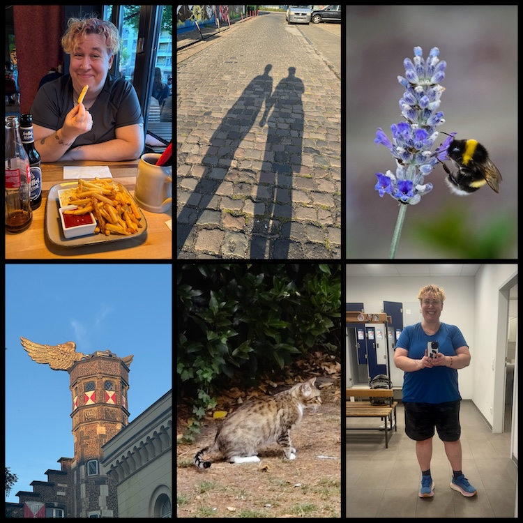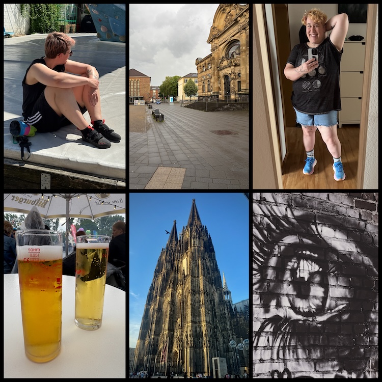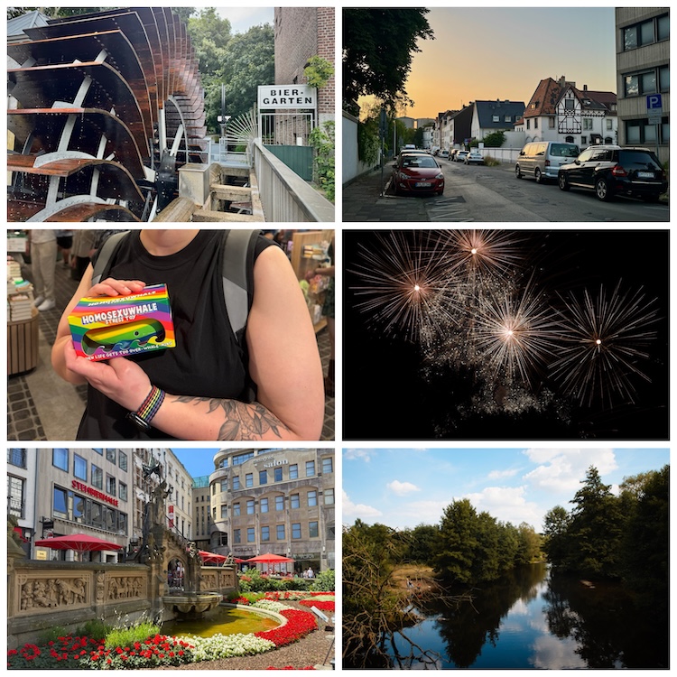 But this post isn’t to talk about relationship stuff! It’s to talk about my six weeks in Germany. Thing is, I didn’t know a lot of German before I got there. My second language is French (semi-fluent), and while I’d studied a tiny bit of German in the past, I def couldn’t have gotten around on my own. But throughout the six weeks, I began to recognize phrases, words, and language cadence. When you take the train all the time, you begin to hear patterns in the overhead announcements. When you cook, you learn to recognize the names of certain ingredients and steps in recipes. Because this wasn’t vacation, there was a lot of simply living: grocery shopping, going to the bank or post office, traveling by train, haircuts, birthday parties for friends, nights out at gay bars or clubs, taking walks along the river, exploring different restaurants, going to summer festivals, watching TV together (including German ads!), learning to use a totally different kind of washer/dryer, trying to pet neighborhood cats, etc. Once, I even accompanied Rainstorm to Urgent Care when they were sick, and we had to stop in a pharmacy for help after they got stung by a giant hornet on a bus (!!!).