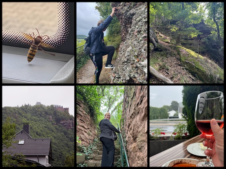 Our plan was to hike around the castle (there’s a loop that goes around it) and then head back for lunch as the various restaurants opened up. Then, depending on weather, we’d decide if we wanted to hike down the hill to the next town before taking the train, or go back to the bus stop. As we set out to do this, it began to rain. Early. It was only drizzling and so we kept going, though I had to shelter my camera rather than take a lot of pictures. It drizzled off and on during that first hike, but we had fun. The number of times Rainstorm said, “I could climb this” while we were next to rock walls (and they can! I’ve seen it!)… 😄