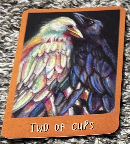 Rainstorm was just home from getting their nightingale tattoo finished when the teaser trailer and date dropped. YAAAAS! Ineffable. Second, there was my tarot card for May, the two of cups, drawn back in December. The two of cups is a card of extremely close friendship and/or romantic love, a pair, or – as they say in GO – a group of the two of us. The art on my deck involves a white bird and a black bird snuggling. Angel/demon wings, anyone? Aaaaaaah! Yeah. The fandom is going crazy. I’m going crazy. It’s perfect, just perfect!